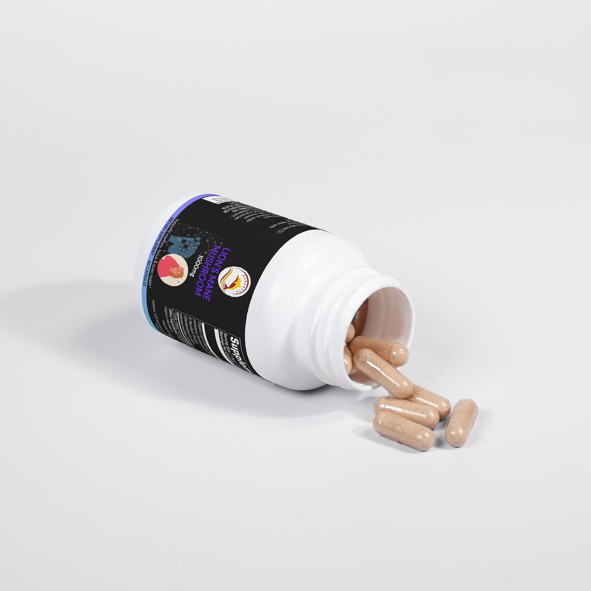 Ingredients: Organic Lion’s Mane (Hericum erinaceus) Mushroom Fruiting Body & Mycelium Powder (Standardized to 40% polysaccharides [400mg]), Vegan Capsule (modified cellulose, water).